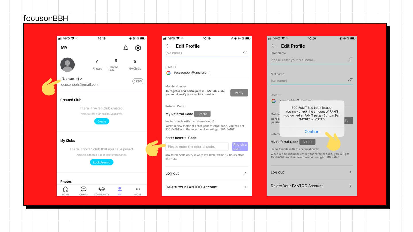Em “My” - Clique em 'No name'. Você estará em “Edit profile” - Role a tela e procure por “Referral Code”, Coloque um código de indicação para ganhar 500 FANiTs. Use o da FOB: SNLZN4A3I9.