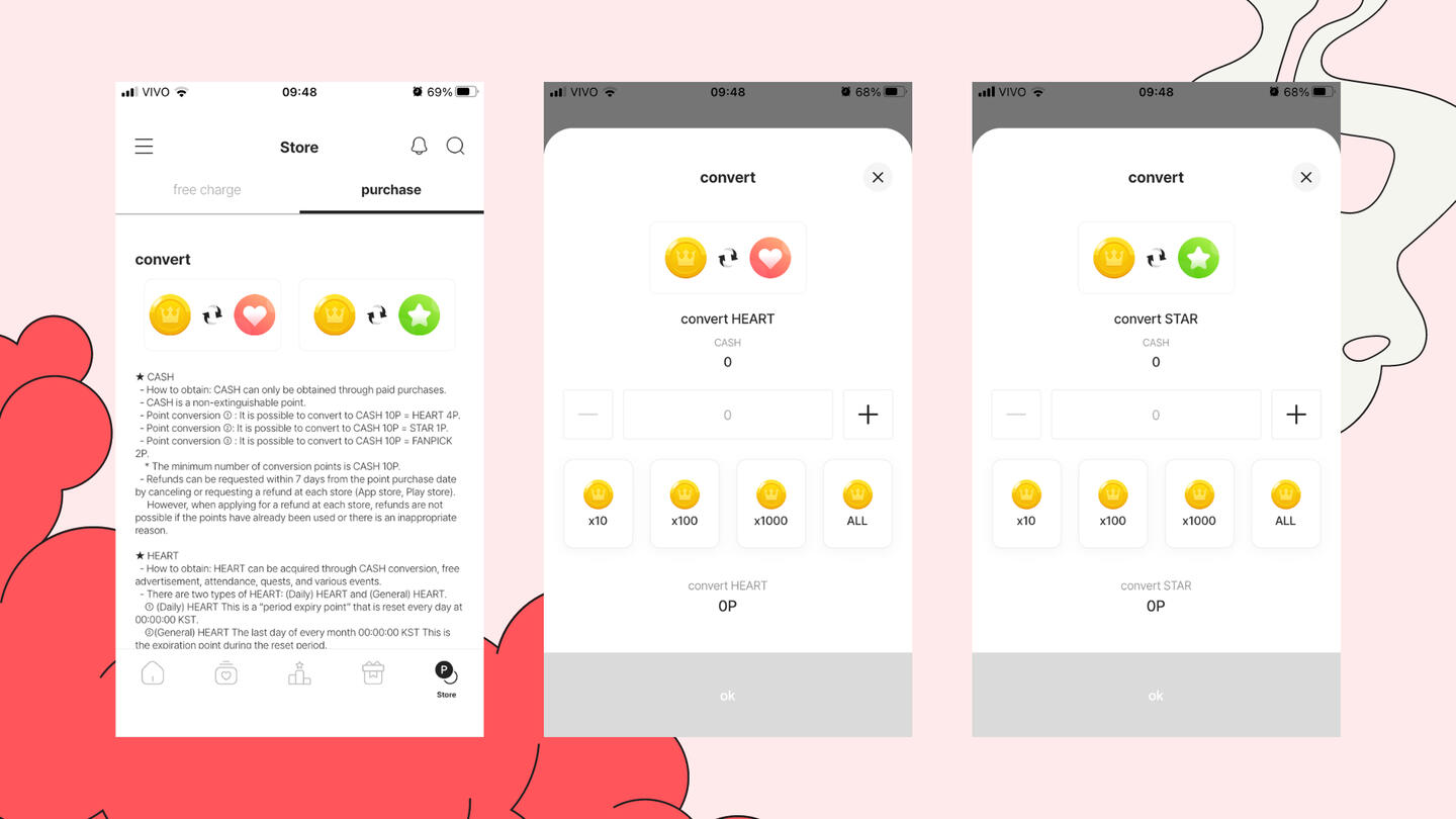 Convertendo CASH: 10 pontos de CASH = 4 pontos de HEART | 10 pontos de CASH = 1 ponto de STAR. | 10 pontos de CASH = 2 pontos de FANPICK. *mais informações detalhadas no texto do final da página.