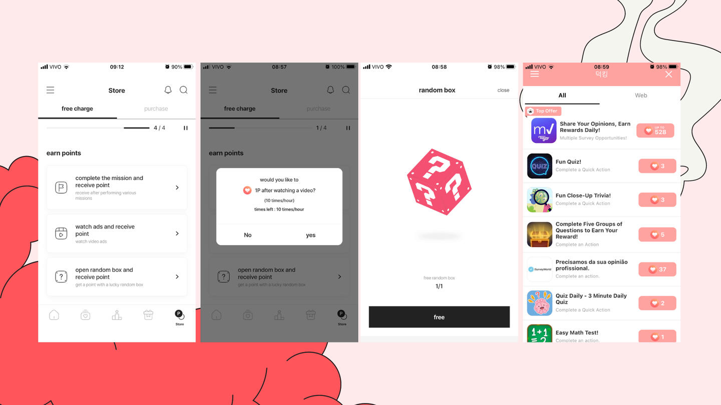 Em “Store: Free Charge”, você tem 3 opções que vão te ajudar a conseguir pontos, concluir missões, ver anúncios e abrir a caixa aleatoria que pode te dar pontos aleatoriamente.*RECOMENDO ler as Informações detalhadas no texto do final da página!