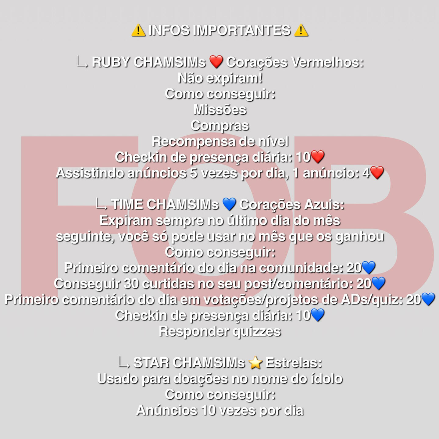 ↳ Poste um link (EXEMPLO: Link de algum MV) e ganhe 100 corações (pode apagar depois). Poste uma foto com qualquer cor sólida no período de recompensa e ganhe 100 corações (pode apagar depois);