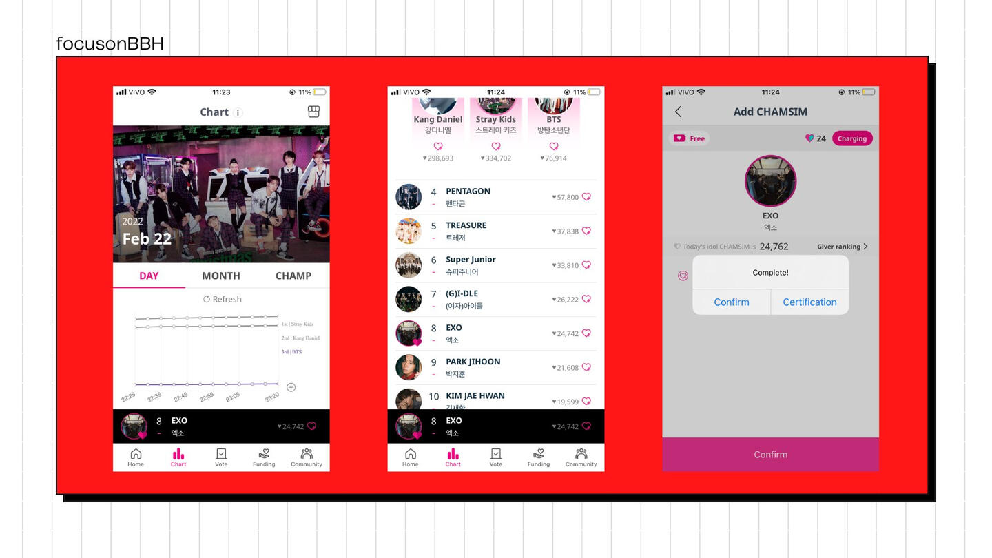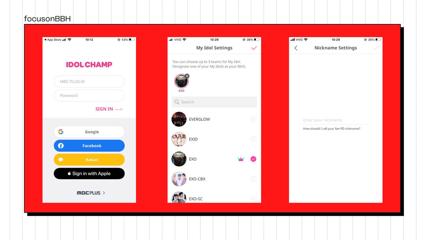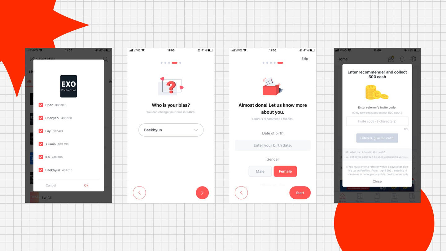 Escolha o grupo EXO/bias. Preencha as informações pessoais. Use um código de convite. Você pode colar este: #d47d62dc. Assim você ganha 500 Cash e consegue comprar votos! Em seguida, o app pede que adicione um número de cel e o verifique pra liberar cash.