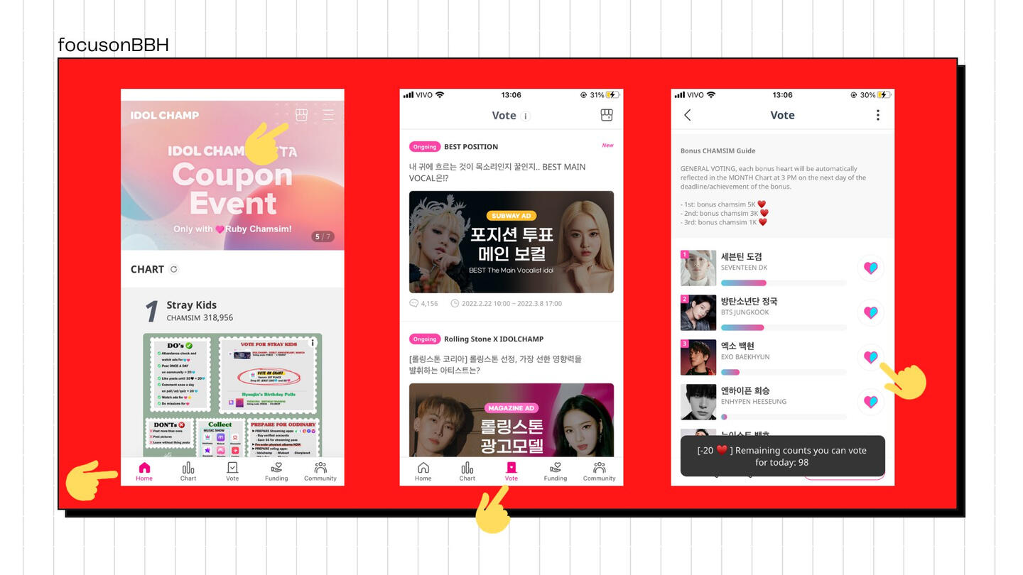 A loja onde se consegue CHAMSIMs fica na aba 'Home/Início', lá você pode ver os anúncios/responder quizzes etc. Para votar vá na aba 'Vote' e procure pela categoria que o Baekhyun está concorrendo. Clique no ícone do coração e vote nele.