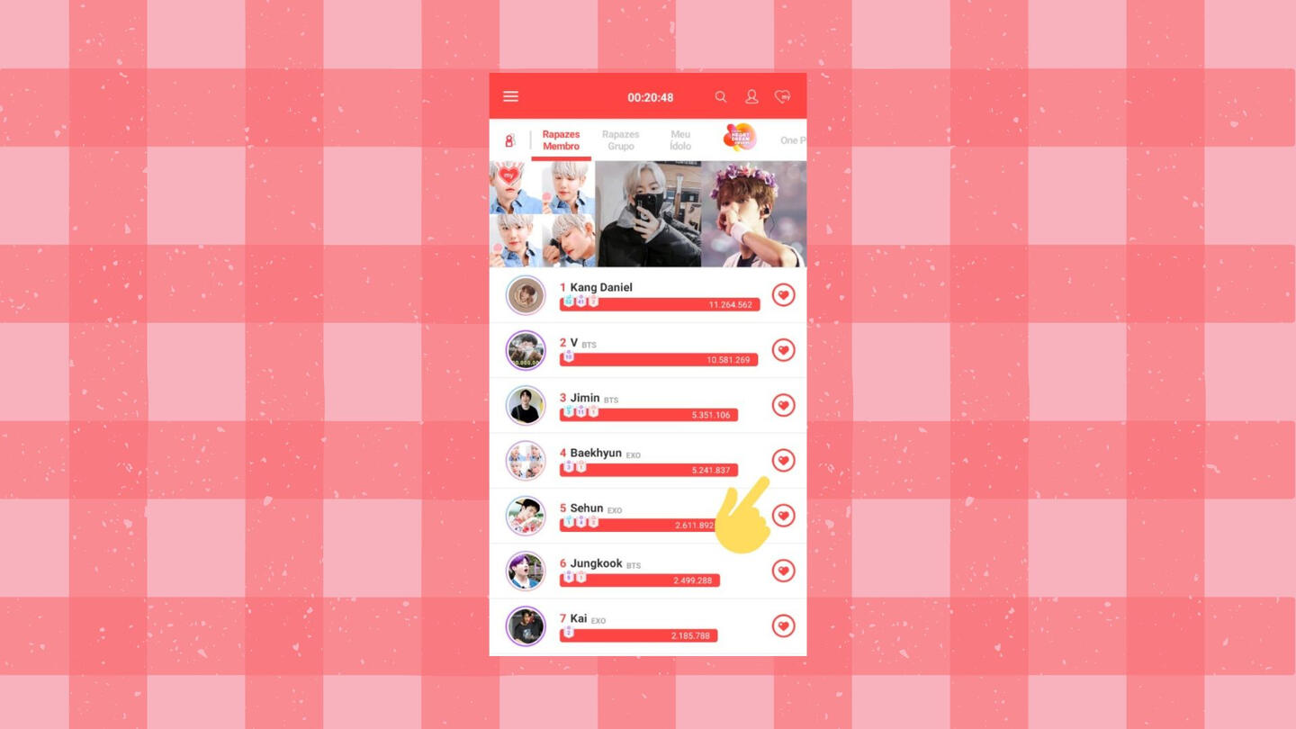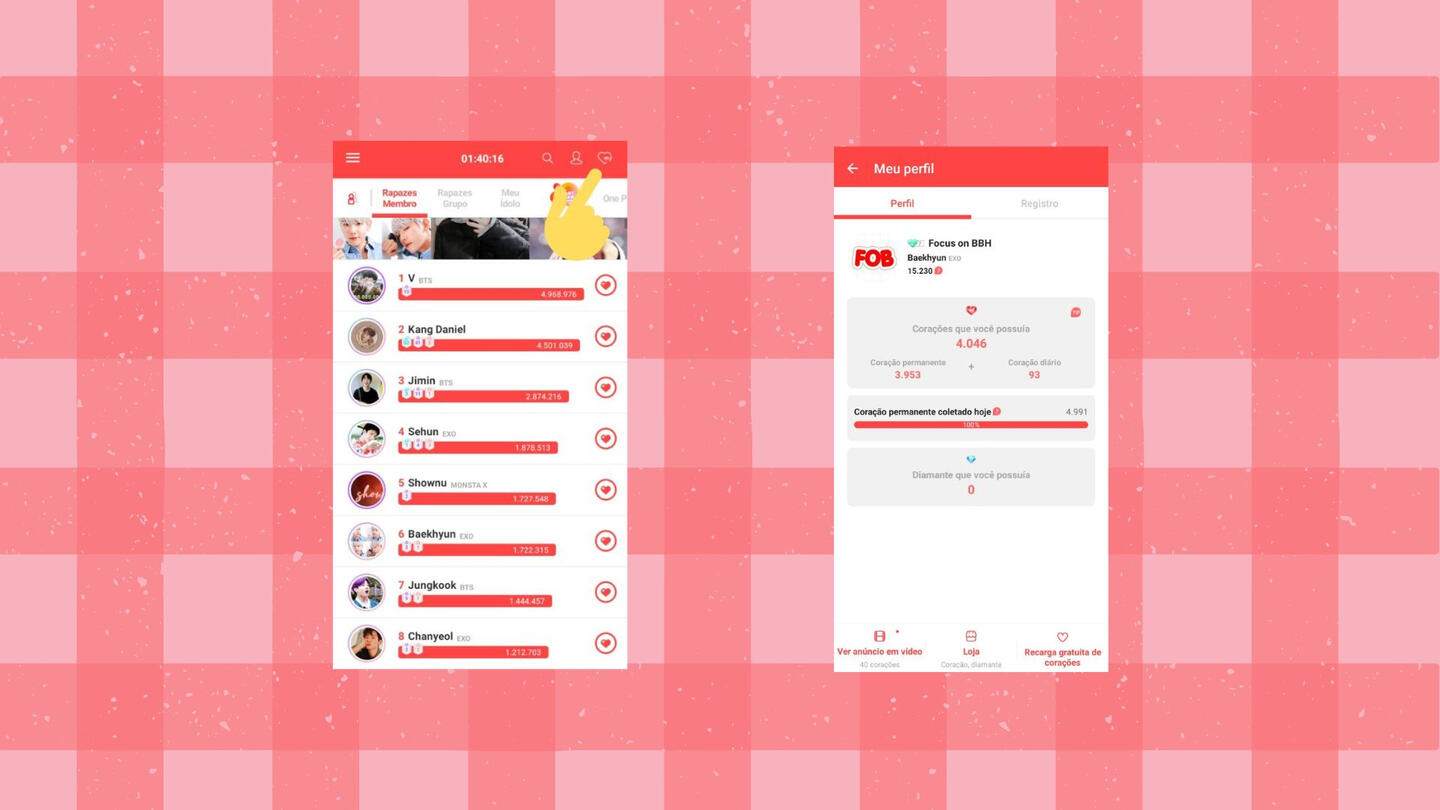 Em amigos: Clique em "todos" e envie HEARTs para todos os amigos (1 HEART a cada 10 min). Na comunidade do BAEKHYUN, aperte no coração com um ponto de interrogação (chance de ganhar até 1000 HEARTs).