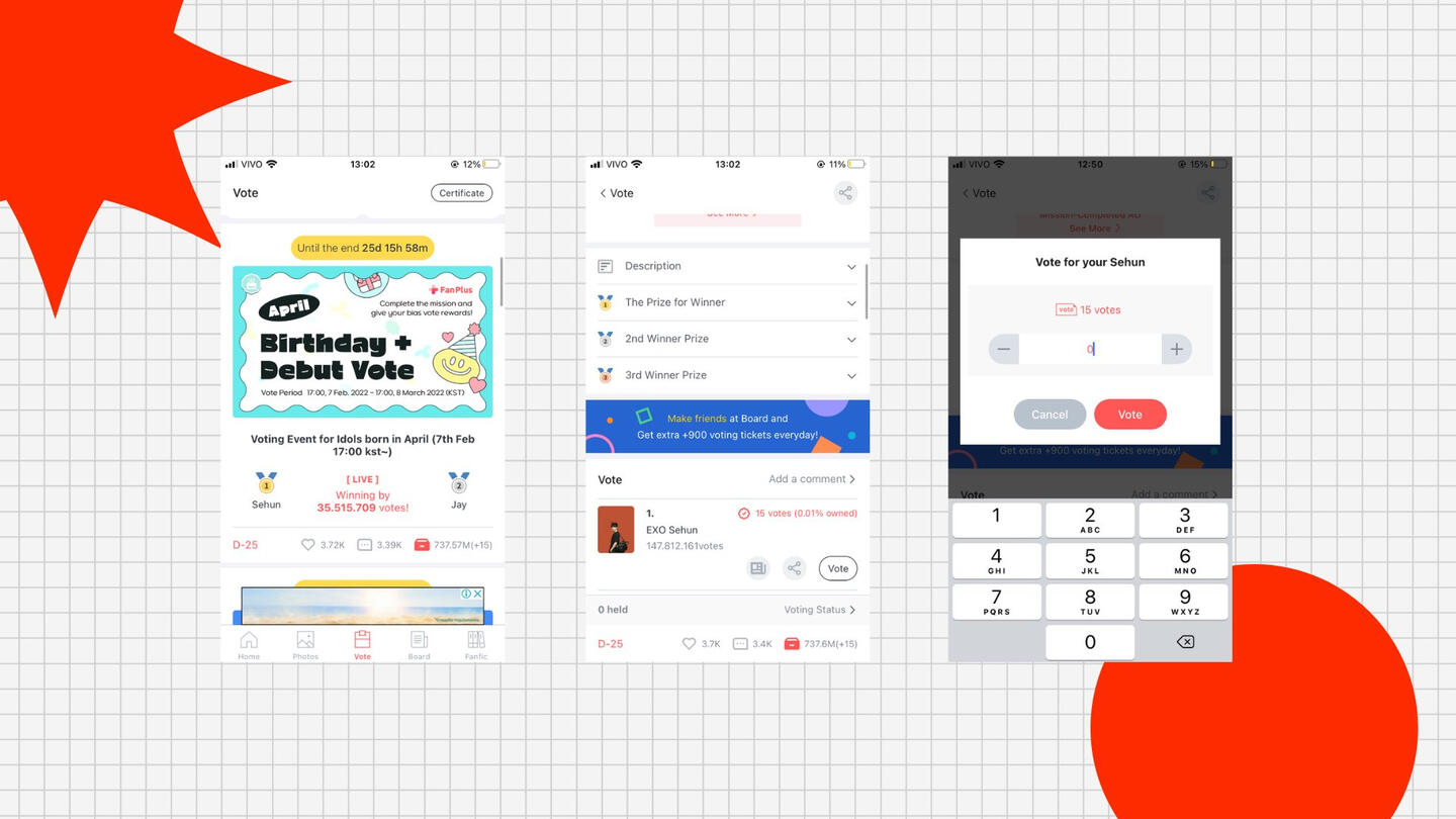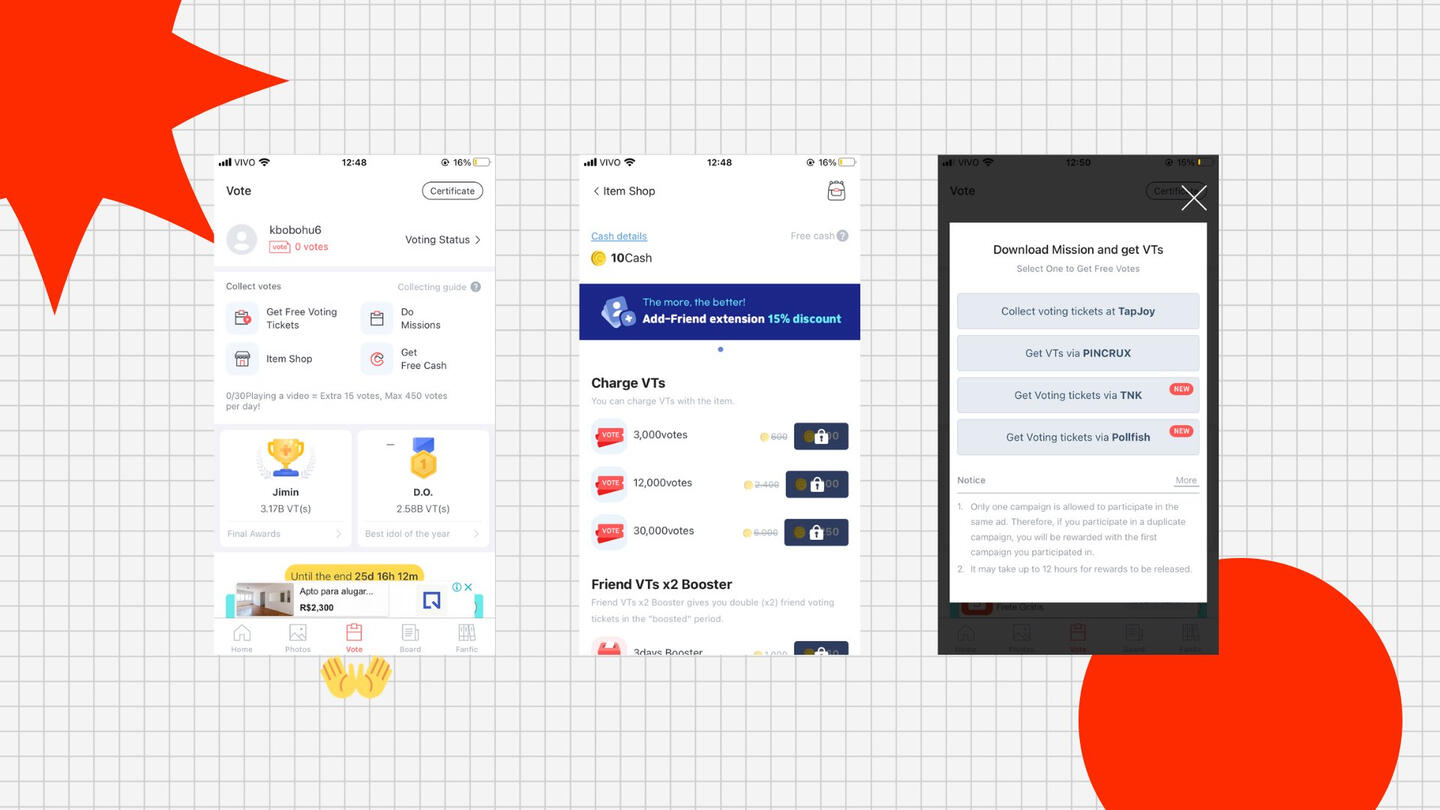 Aba ‘Vote’. Em ‘Get Free Voting Tickets’ você vê até 30 anúncios por dia e ganha 15 votos por cada anúncio. Em ‘Item Shop’ você troca seu Cash por votos. Em ‘Do Missions’ você faz missões e é recompensado com votos equivalente à missão que completar.
