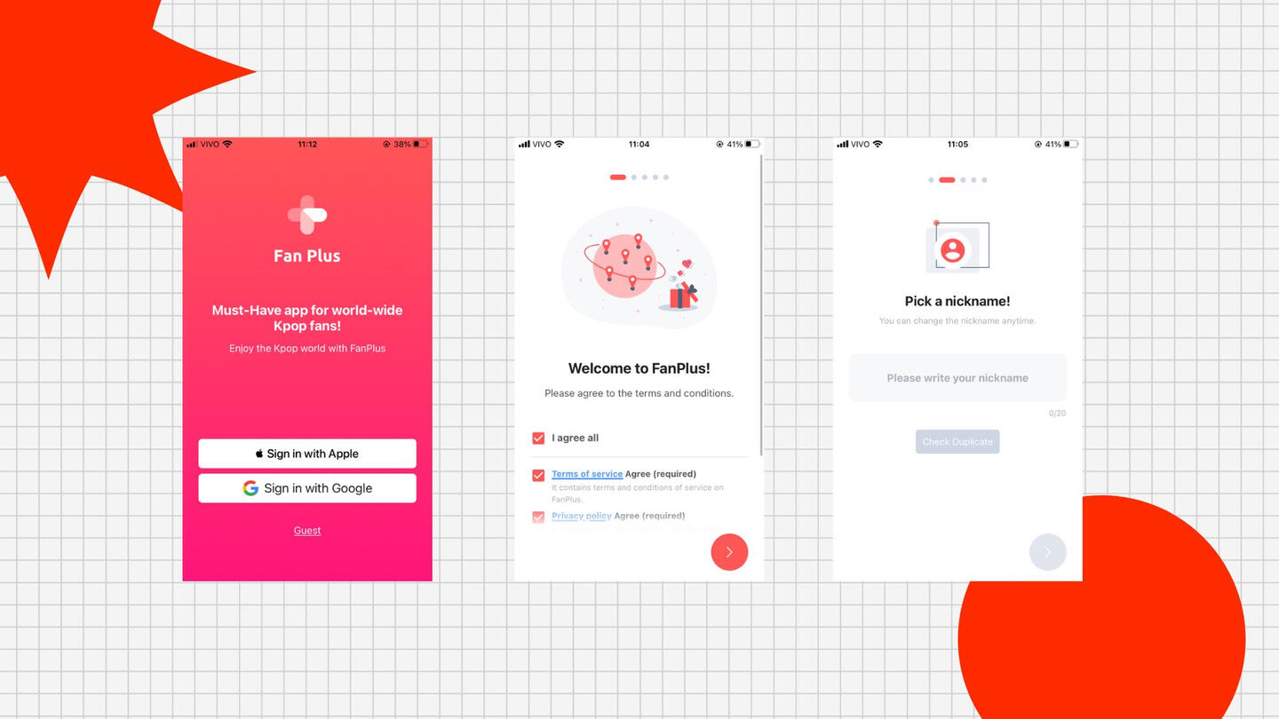 Crie sua conta com google, facebook ou kakaotalk e concorde com os termos do app. Selecione o EXO como seu idol. Crie um nome de usuário.