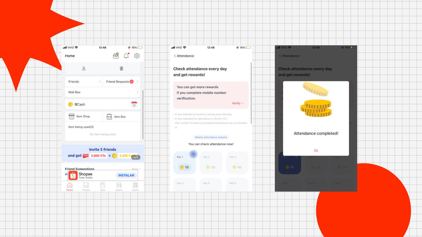 Na aba ‘Home’: Em ‘Friends’ você pode procurar amigos pelo nome de usuário e enviar votos para eles diariamente! *Contas com números de telefone vinculado podem adicionar ate 50 amigos, as que não têm um número vinculado, apenas 3 amigos.